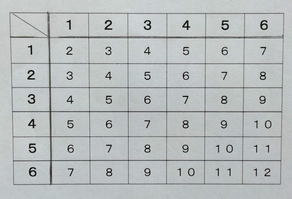 2つのサイコロ問題の全ての場合の数は6×6=36通りになる。